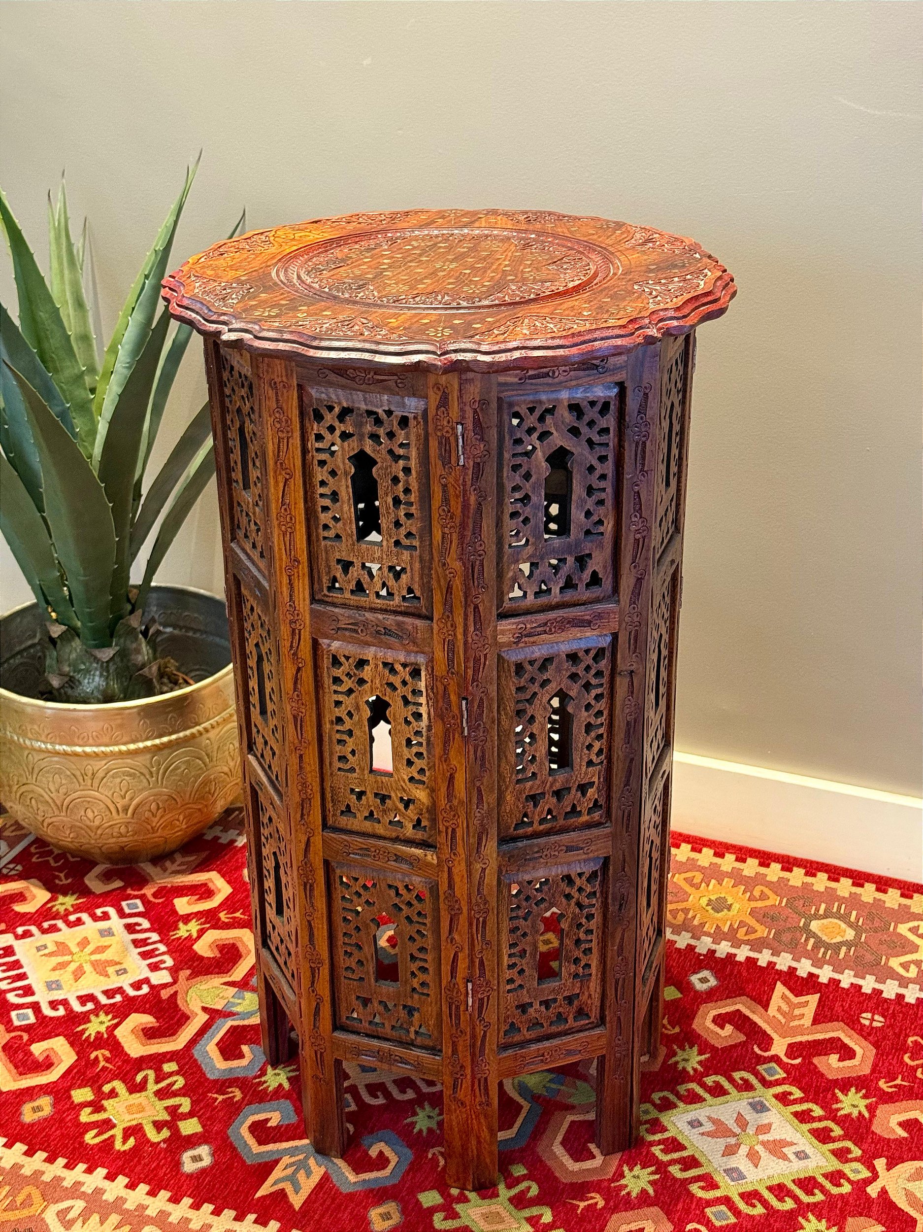 Os detalhes que encantam nessa charmosa mesa de canto, entalhada em madeira com desenhos em flores e arabesco.