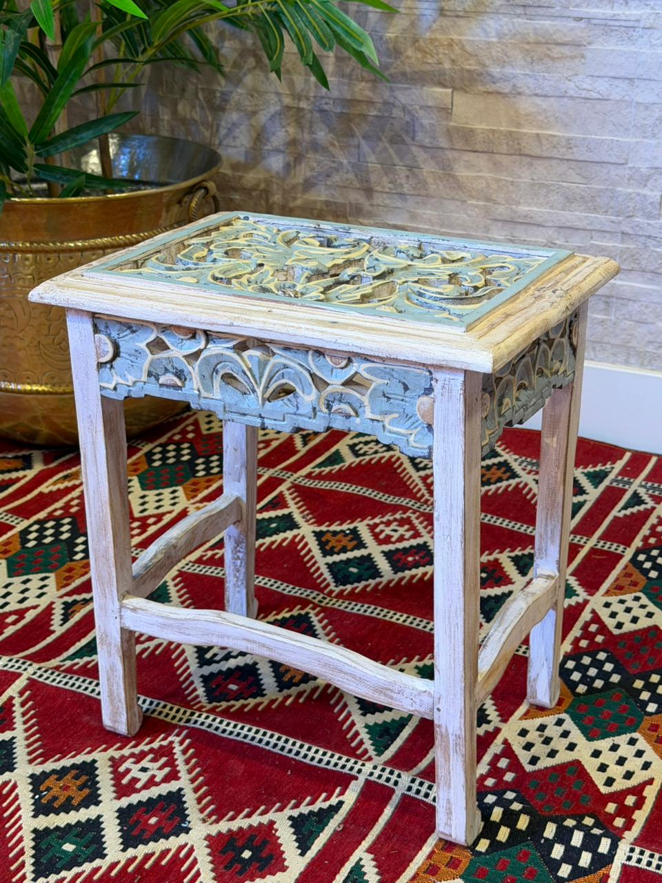 Encanto para quem ama decoração com alma. Mesa Indiana é inteiramente trabalhado em madeira e recebe delicados desenhos pintados à mão, trazendo o charme e a autenticidade do artesanato.