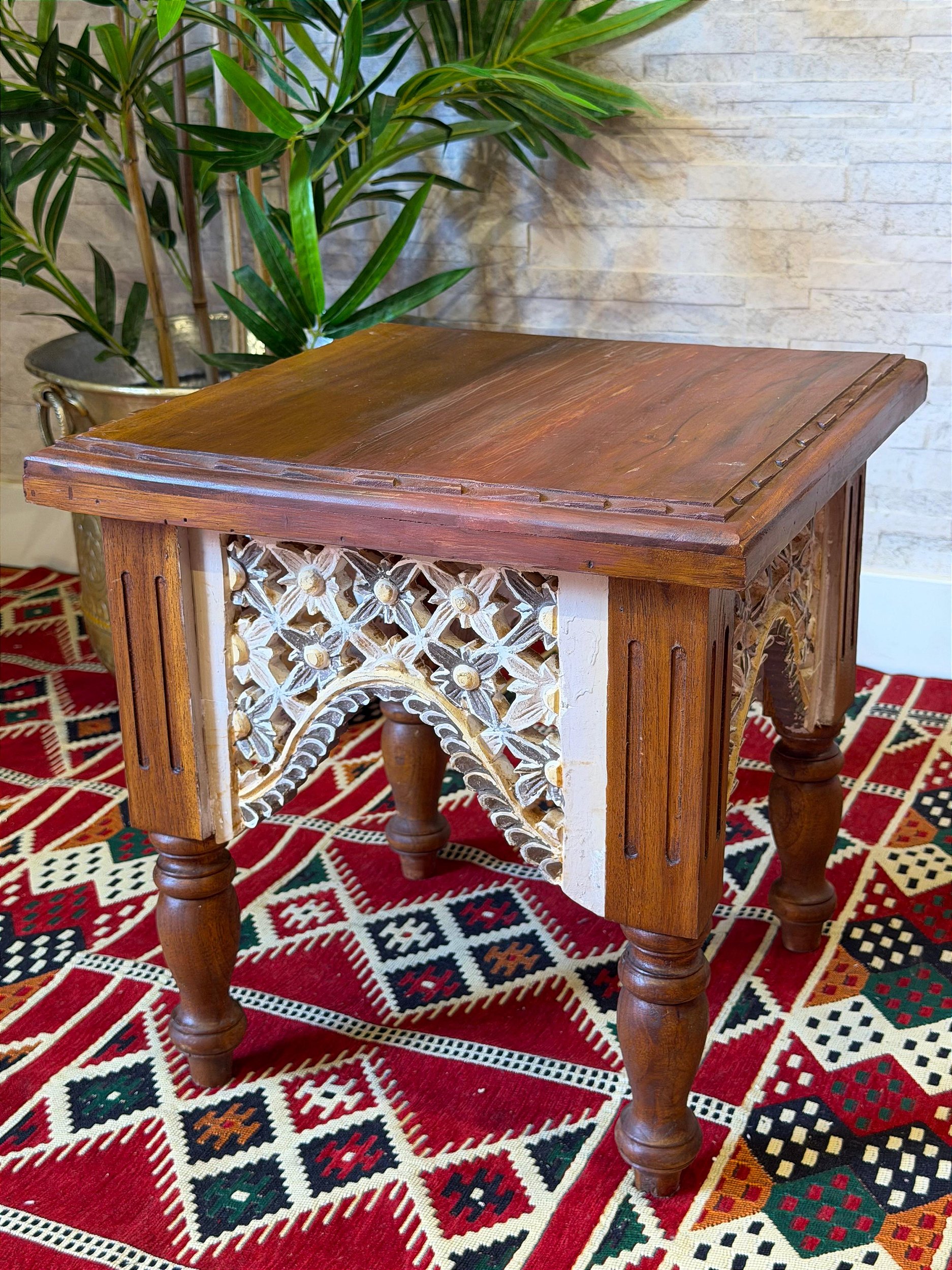 Os detalhes que encantam nessa charmosa mesa de canto, entalhada em madeira com desenhos em flores e arabesco.