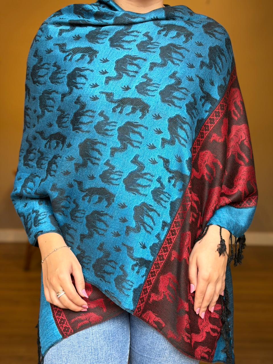 Pashmina de Viscose - Estampada - Dupla Face - Azul, Preto e Vermelho