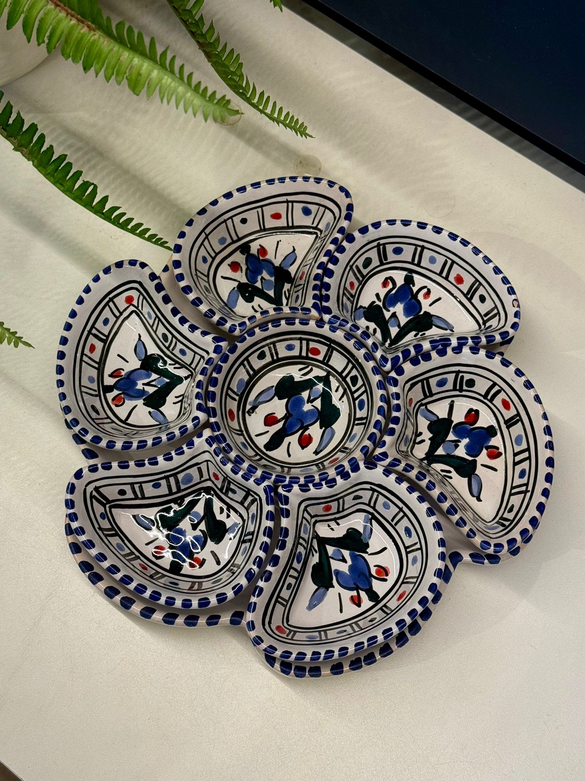As petisqueiras de cerâmica da Marrocos For You irão adicionar alegria e elegância no momento de servir os petiscos mais deliciosos. Seja em situações rotineiras quanto em eventos com família e amigos, ela é super prática, fácil de limpar e muito bem trabalhada! A pintura a mão em relevo acrescenta um toque especial para a peça, importada da Tunísia. Pode ser comprada para presentear alguma pessoa querida, ou para acrescentar aos seus itens de cozinha. O que está esperando? Aproveite nossas condições e compre já a sua!