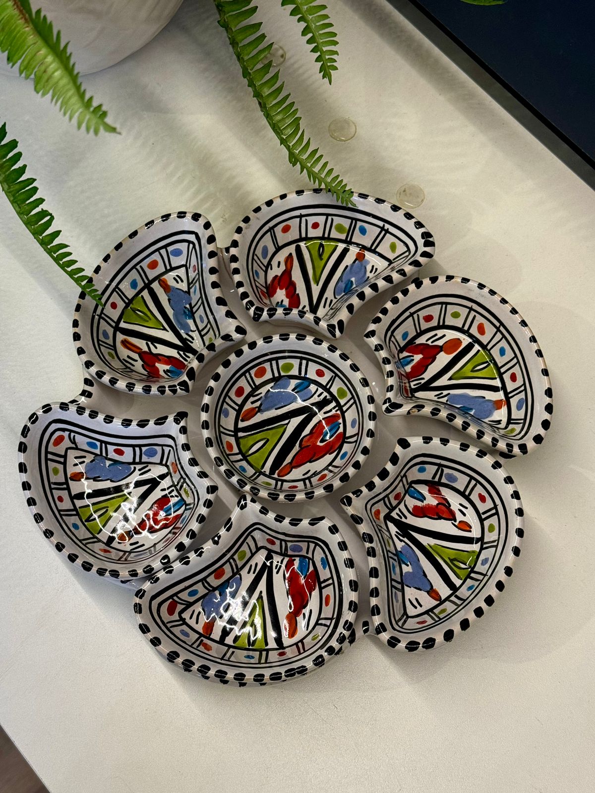 As petisqueiras de cerâmica da Marrocos For You irão adicionar alegria e elegância no momento de servir os petiscos mais deliciosos. Seja em situações rotineiras quanto em eventos com família e amigos, ela é super prática, fácil de limpar e muito bem trabalhada! A pintura a mão em relevo acrescenta um toque especial para a peça, importada da Tunísia. Pode ser comprada para presentear alguma pessoa querida, ou para acrescentar aos seus itens de cozinha. O que está esperando? Aproveite nossas condições e compre já a sua!