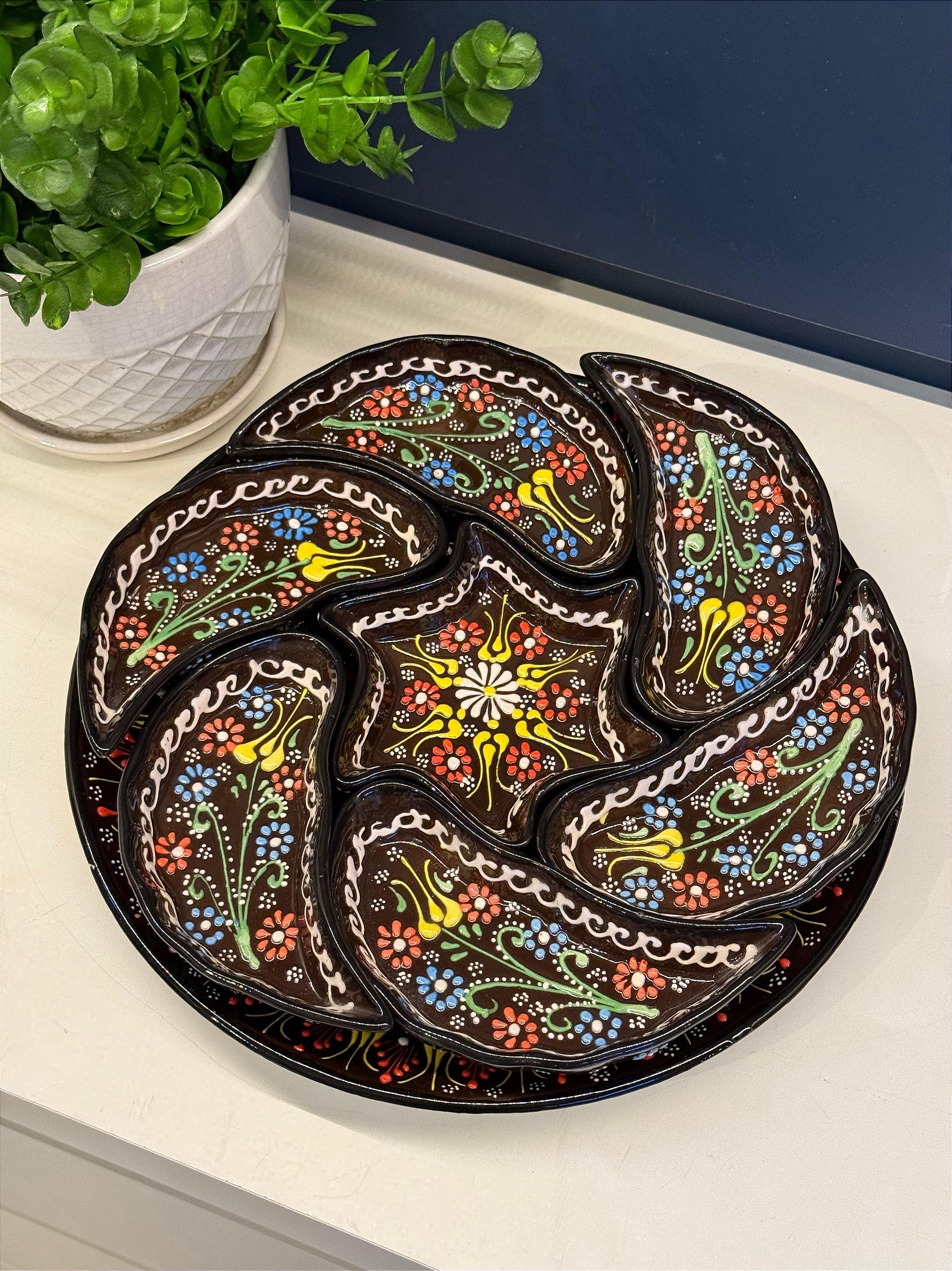 As petisqueiras de cerâmica da Marrocos For You irão adicionar alegria e elegância no momento de servir os petiscos mais deliciosos. Seja em situações rotineiras quanto em eventos com família e amigos, ela é super prática, fácil de limpar e muito bem trabalhada! A pintura a mão em relevo acrescenta um toque especial para a peça, importada da Turquia. Pode ser comprada para presentear alguma pessoa querida, ou para acrescentar aos seus itens de cozinha. O que está esperando? Aproveite nossas condições e compre já a sua!