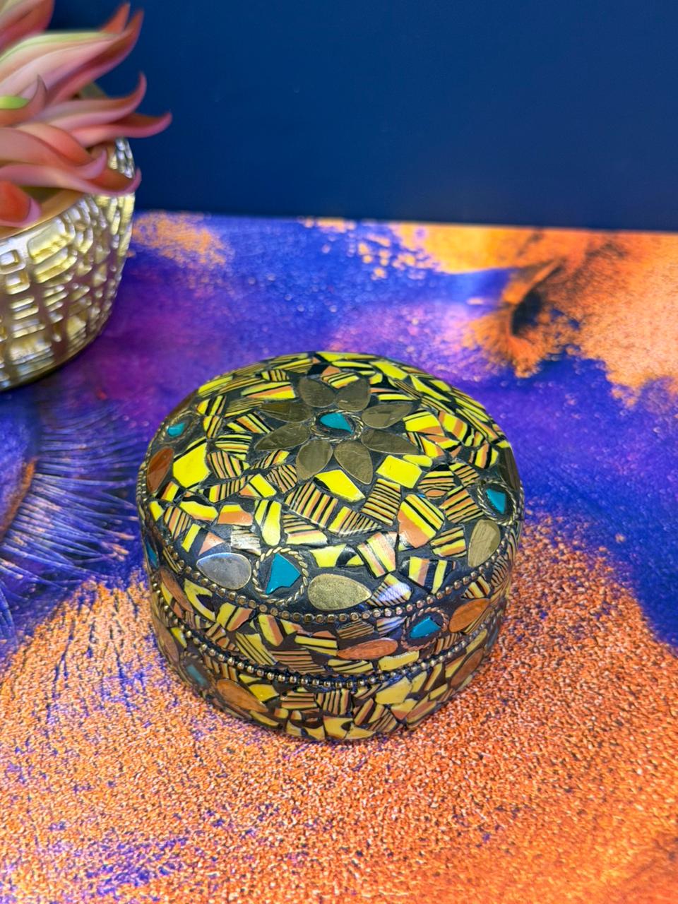 Porta Joias - Metal - Feito à mão - Amarelo, Dourado e Turquesa - 7,5CM
