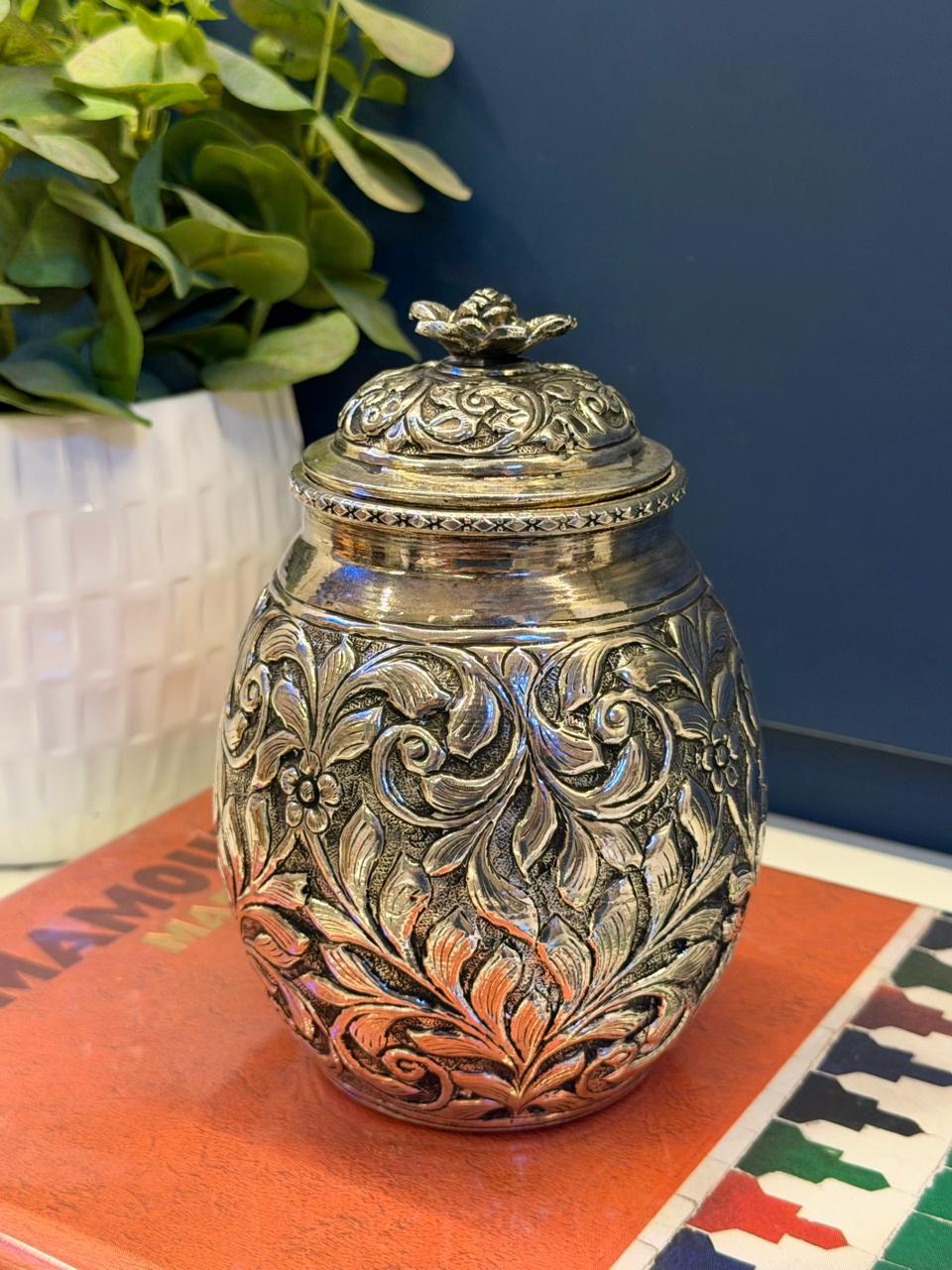 Uma peça cheia de personalidade e simbolismo. Este pote decorativo Indiano é produzido em alpaca e trabalhado a mão, exibindo relevos ricos em detalhes que trazem toda a beleza da arte tradicional do Oriente.