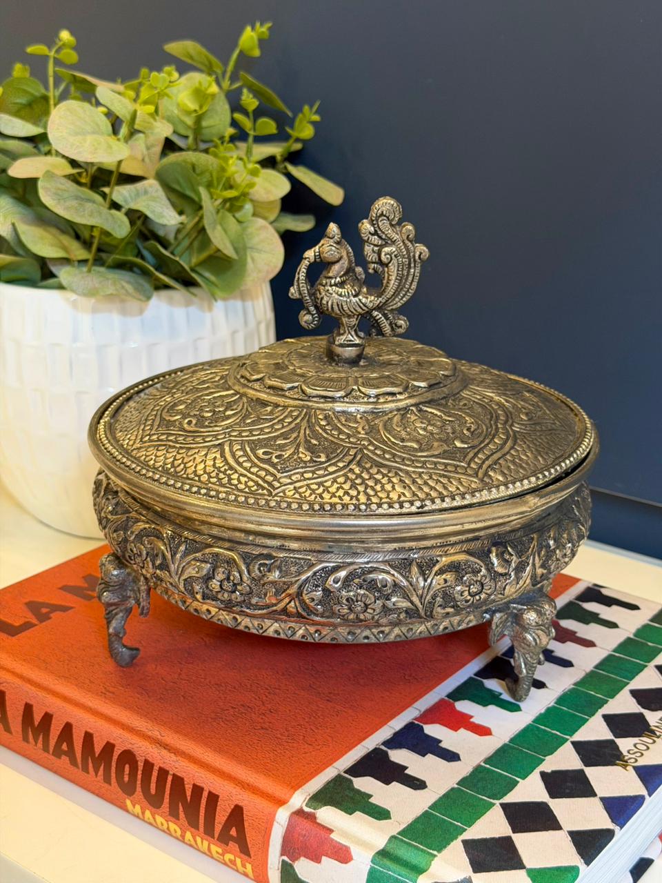 Uma peça cheia de personalidade e simbolismo. Este pote decorativo Indiano é produzido em alpaca e trabalhado a mão, exibindo relevos ricos em detalhes que trazem toda a beleza da arte tradicional do Oriente.