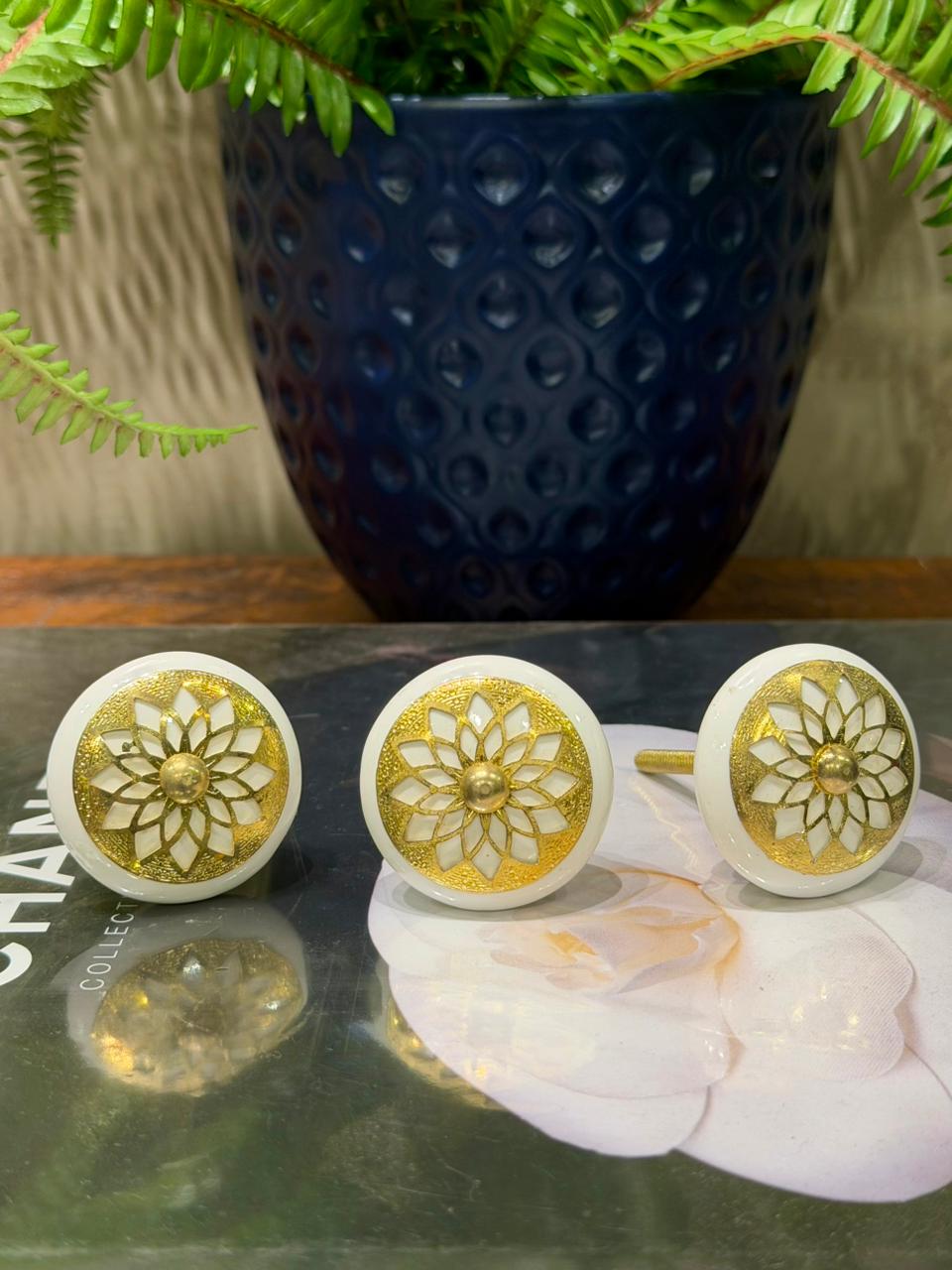 Puxador em Cerâmica - Pintado - Branco e Dourado - Acabamento Dourado