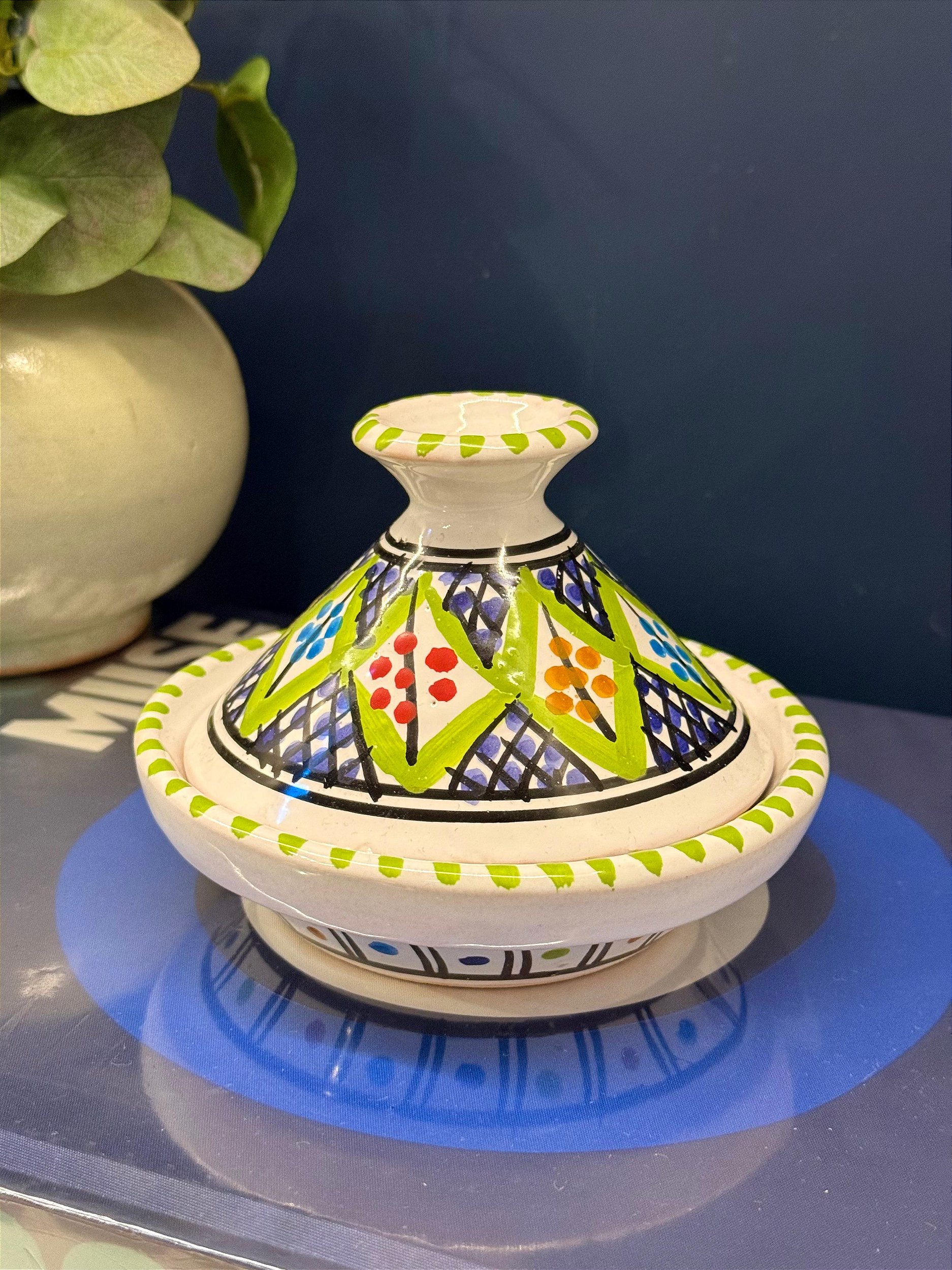 Tagine Saleiro Marroquino - Cerâmica - Pitando à mão - Verde e Colorido