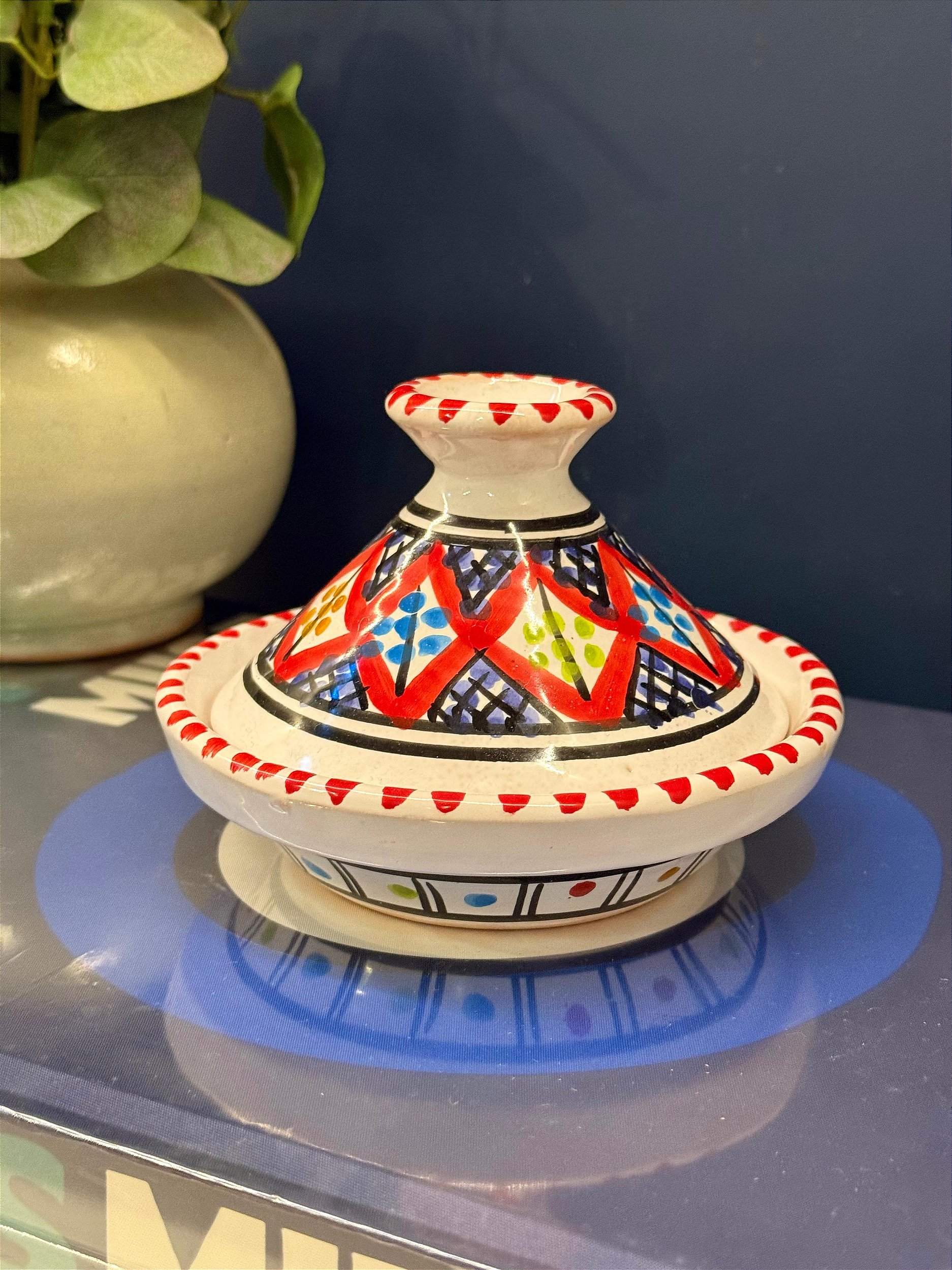 Tagine Saleiro Marroquino - Cerâmica - Pitando à mão - Vermelho e Colorido